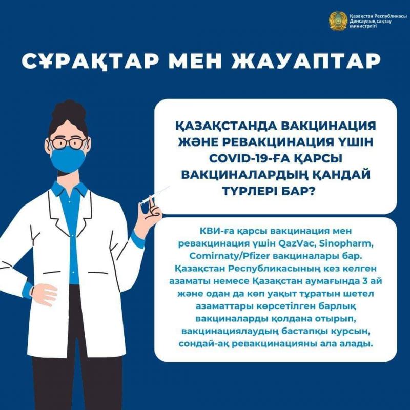 КВИ-ға қарсы вакцинация мен ревакцинация үшін QazVac, Ѕіnорһаrm, Comirnaty/Pfizer вакциналары бар. Қазақстан Республикасының кез келген азаматы немесе Қазақстан аумағында 3 ай және одан да көп уақыт тұратын шетел азаматтары көрсетілген барлық вакциналарды қолдана отырып, вакцинациялаудың бастапқы курсын, сондай-ақ ревакцинацияны ала алады.
