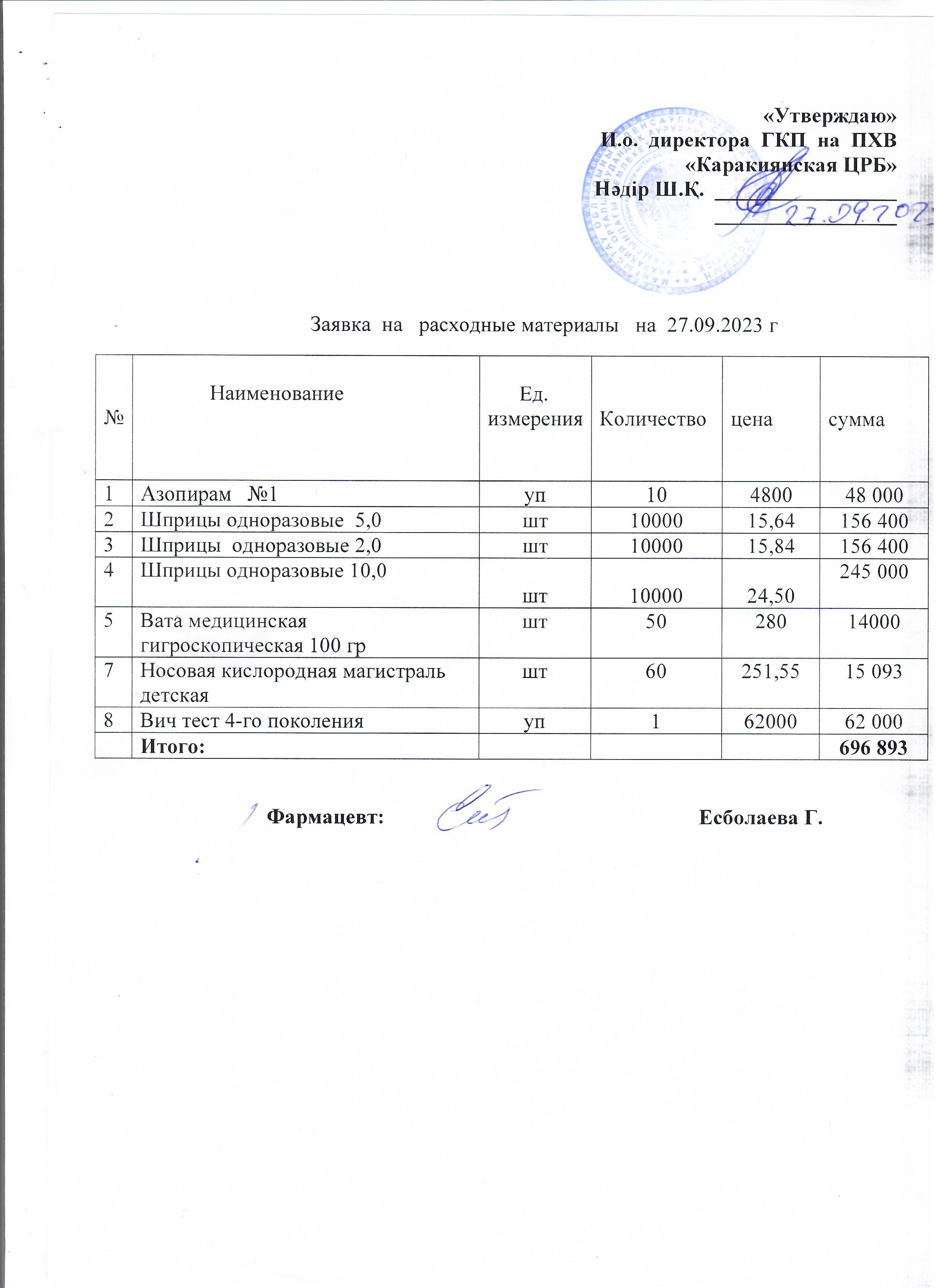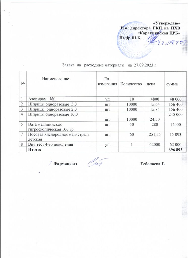 Заявки на участие в закупе способом запроса ценовых предложений на 2023 год, запечатанные в конверты, представляются потенциальными поставщиками до 12:00 часов 05 октября 2023 года по адресу: 130300, Республики Казахстан, Мангистауская область село Курык Каракиянский район, 2 микрорайон здание №2 отдел государственных закупок.