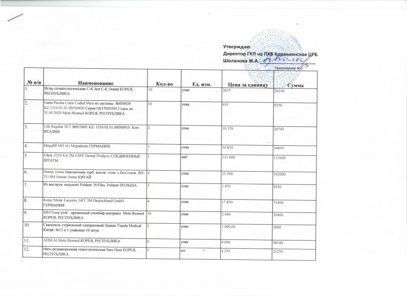 В приложении 1 указаны: наименования закупаемых товаров на проведения закупа  стоматологического изделия и медицинского назначения,  объем закупа, место поставки, сумма выделенную для закупа по каждому товару; Заявки на участие в закупе способом запроса ценовых предложений  медицинские назначения  и стоматологические изделия  на 2017 год, запечатанные в конверты, представляются потенциальными поставщиками до 12:00 часов 18 сентября 2017 года по адресу: 130000, Республика Казахстан, Мангистауская область село Курык Каракиянский район, 2 микрорайон здание №2 отдел государственных закупок. Контактные телефоны: 8 (701 421 71 09).
